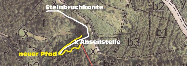 2) Der genannte Weg ist der auch bisher übliche Zugang: Vom Rodelhaus kommend gerade weiter auf dem Weg mit dem Schild 'Sackgasse' bis an den Rand des Steinbruchs (Zaun und Warnschild). Die dort 2015 eingerichtete Abseilpiste wurde auf Anraten des Vogelschutzes abgebaut, da von dort der Brutplatz des Falken einsehbar war. Hier geht man abwärts und wendet sich auf einem alten Pfad scharf nach rechts, um durch die dichten Fichten am Wandfuß die Steinbruchwand zu erreichen.
